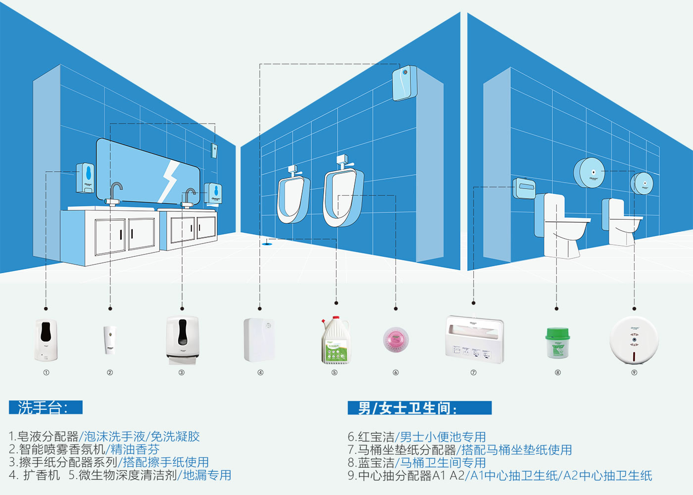 萬戈衛(wèi)生間商用清潔衛(wèi)生用品解決方案,有效解決常規(guī)衛(wèi)生間使用大卷紙安全性差,隨意拽取造成浪費(fèi),拉扯時大面積接觸紙張有交叉感染風(fēng)險。