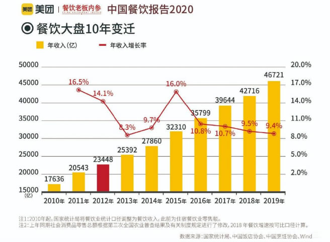 中國現(xiàn)代餐飲行業(yè)具有起步晚但發(fā)展快的 特點。改革開放以后,物質(zhì)生活極大豐富,居 民收入水平提高,餐飲行業(yè)飛速發(fā)展。據(jù)美 團發(fā)布的《中國餐飲大數(shù)據(jù)2020》統(tǒng)計, 2019年中國餐飲行業(yè)規(guī)模約為4.67萬億元/ 同比增長9.4% (占當年GDP的4.71%);